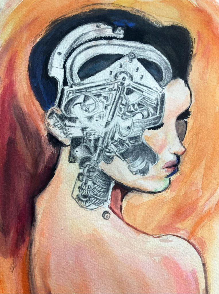 Inspired by Spanish artist Fernando Vicente, I drew a woman with a mechanical brain. It challenges our perception of the world and how comfortable we are calling ourselves human.