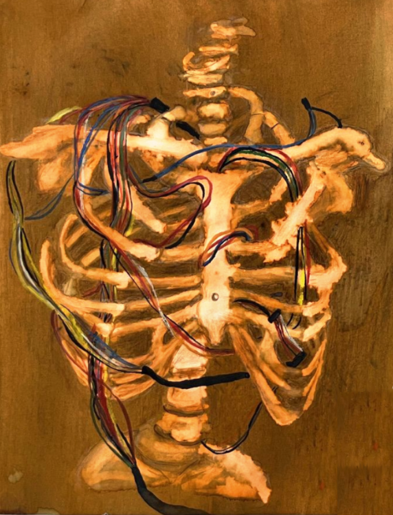 I also did a piece with skeletons and wires. Inside our brains, neurons communicate through electrical signals. Wires in computers also transmit data through electricity. Is consciousness produced by electricity? Could our neural system be replaced by wires?
