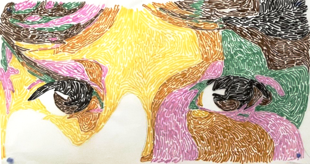 This marker drawing uses vibrant colours as if looking at a computer screen.